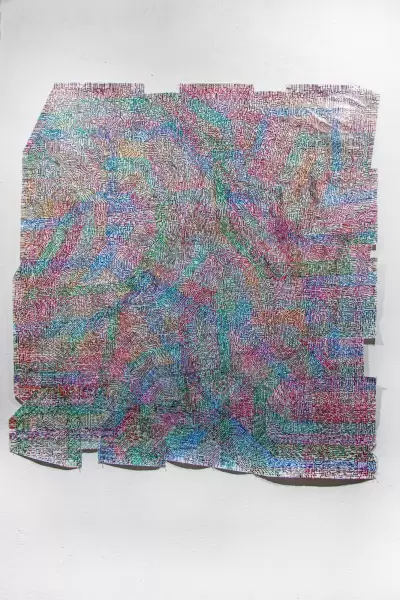 For this Inside Artphilein, the Foundation called upon the Togolese artist Ako Atikossie. Atikossie’s painting practice has always dialogued with three-dimensionality and his experimentation with matter. It is characterised by the use of the minus sign, which intertwines and overlaps in infinite parallel or converging lines, in a weaving that forces the material to make continuous changes.